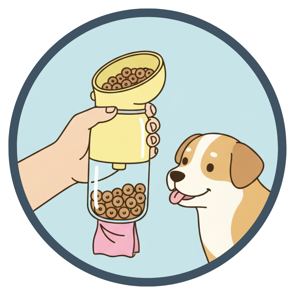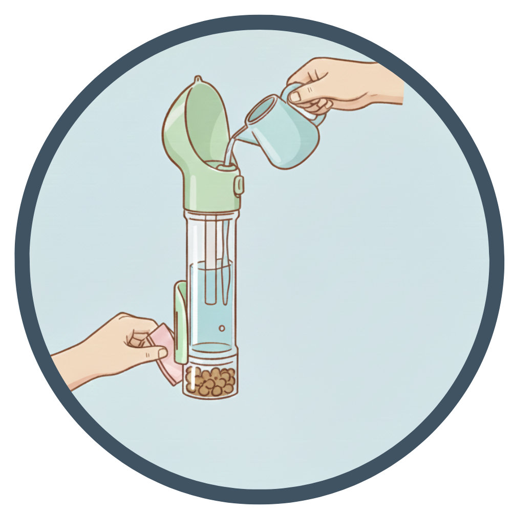 Напълни бутилката с вода и добави лакомства или торбички за отпадъци в предназначените за тях отделения, преди да излезеш.